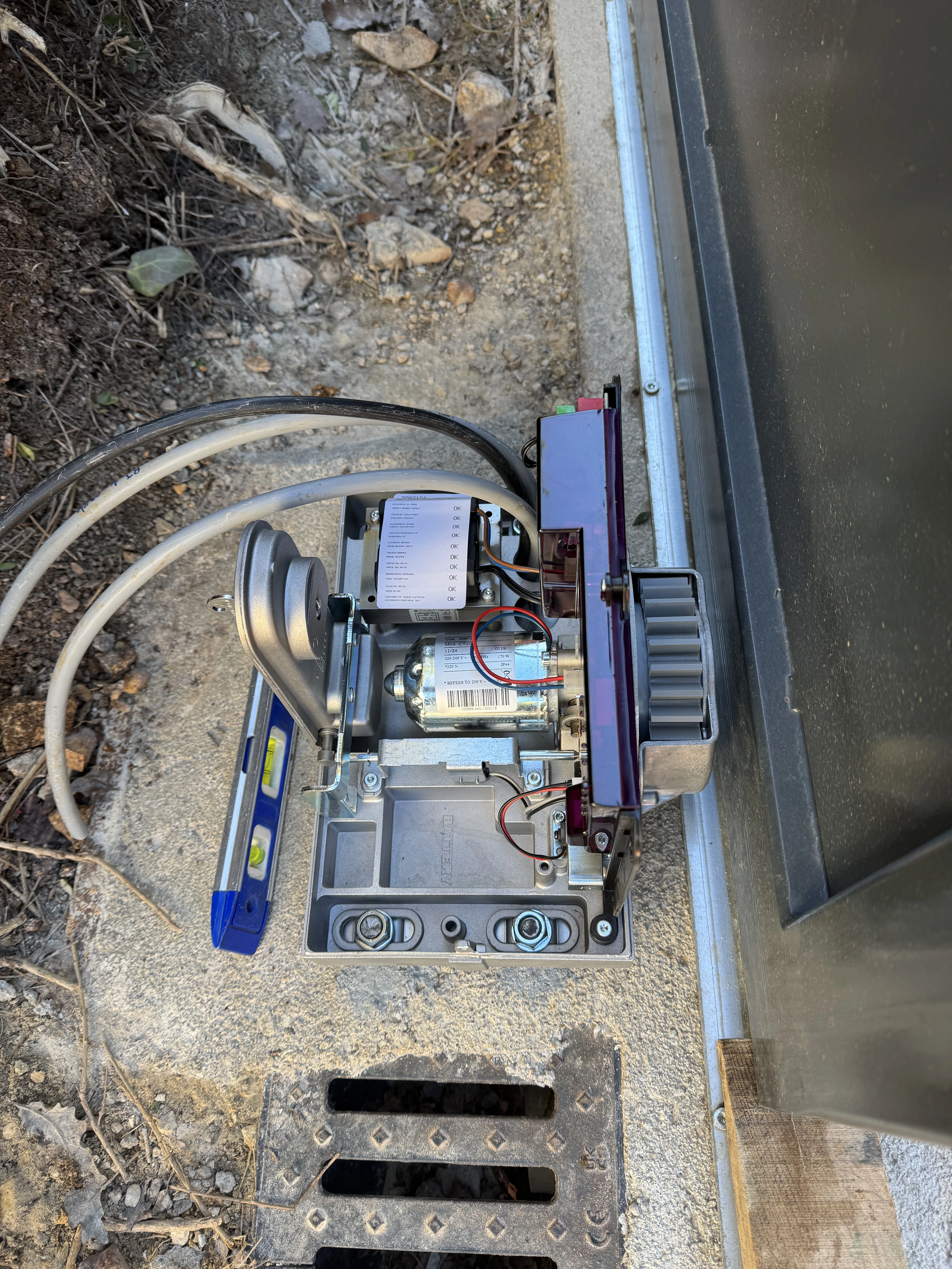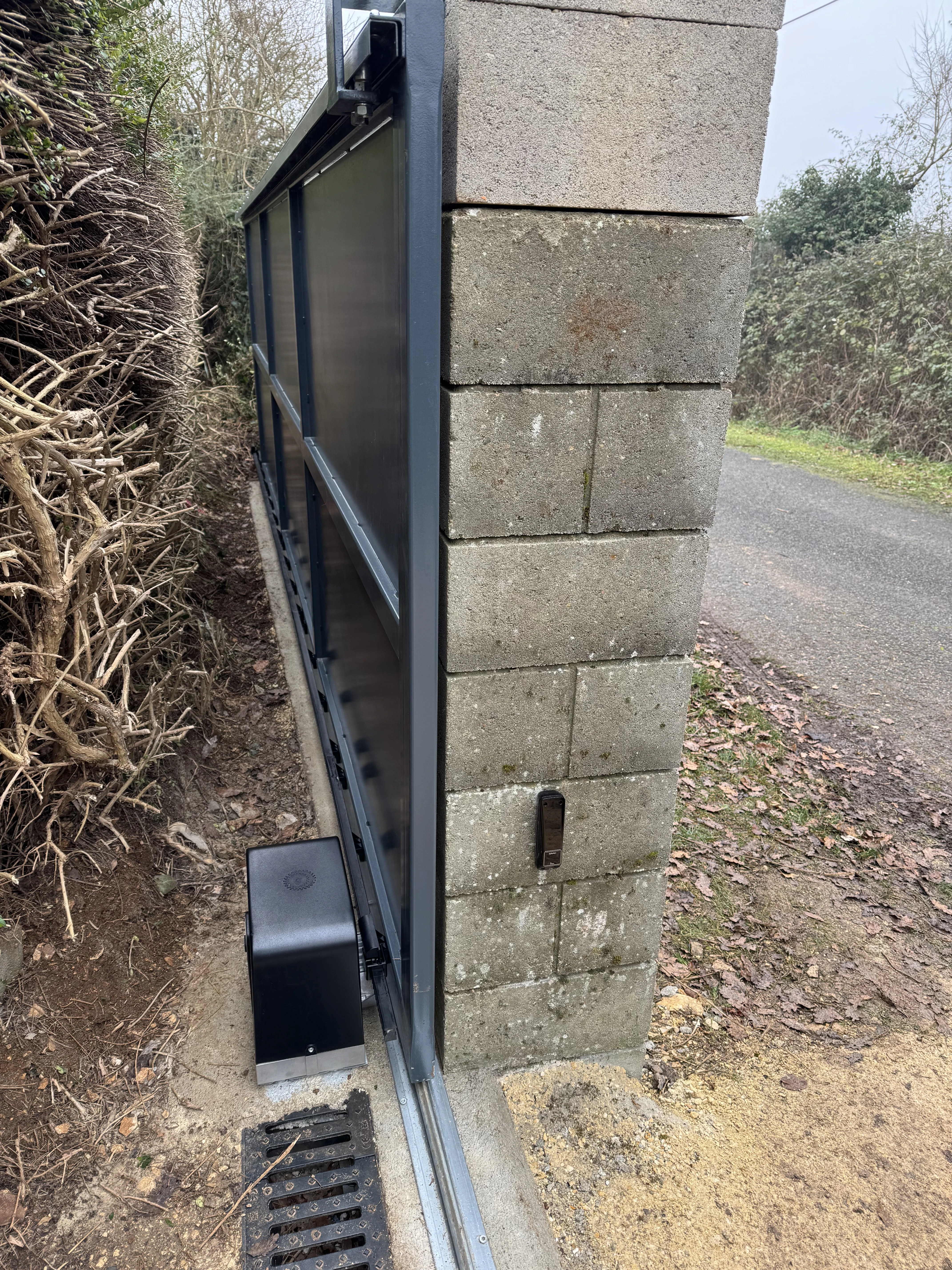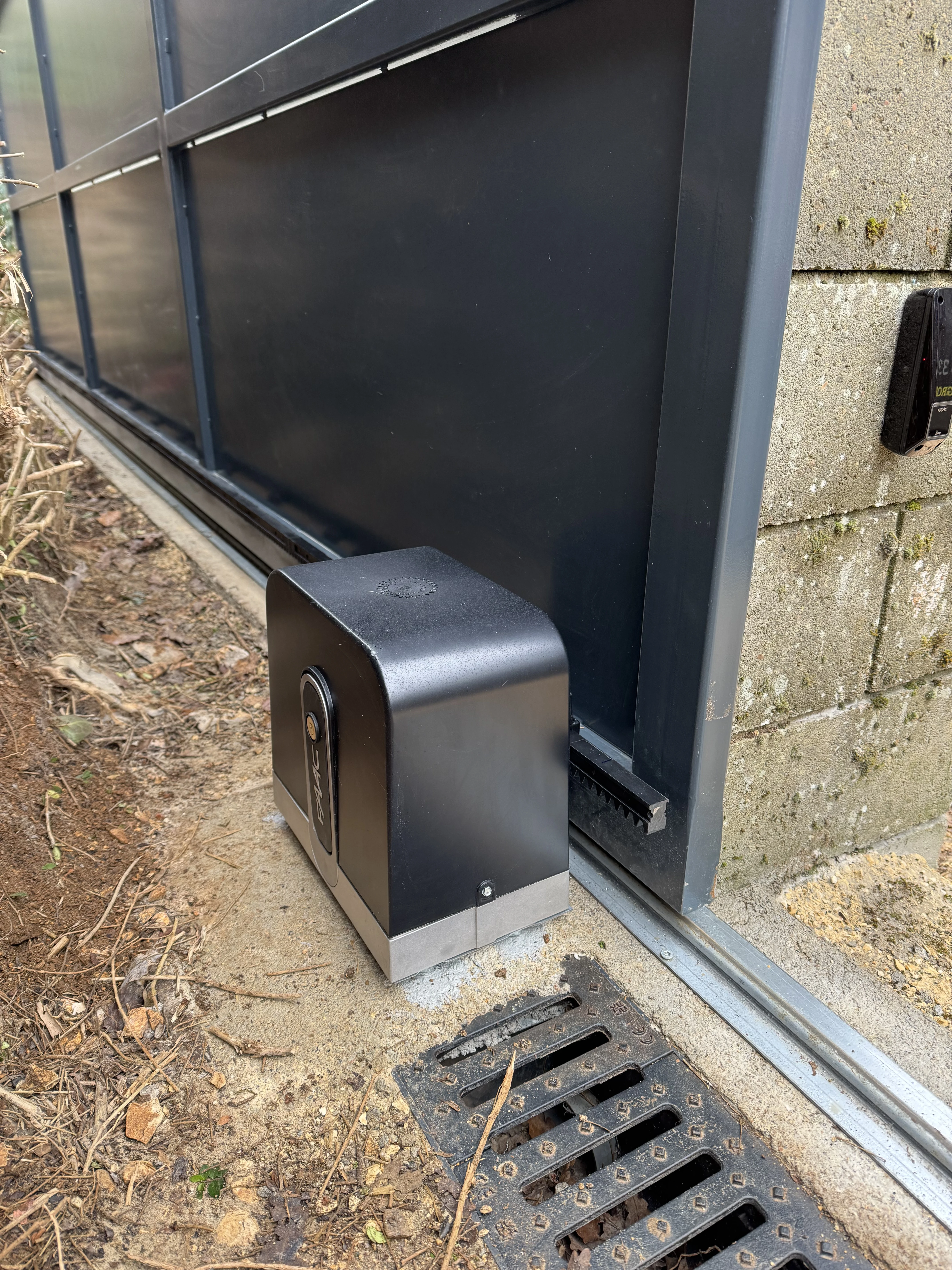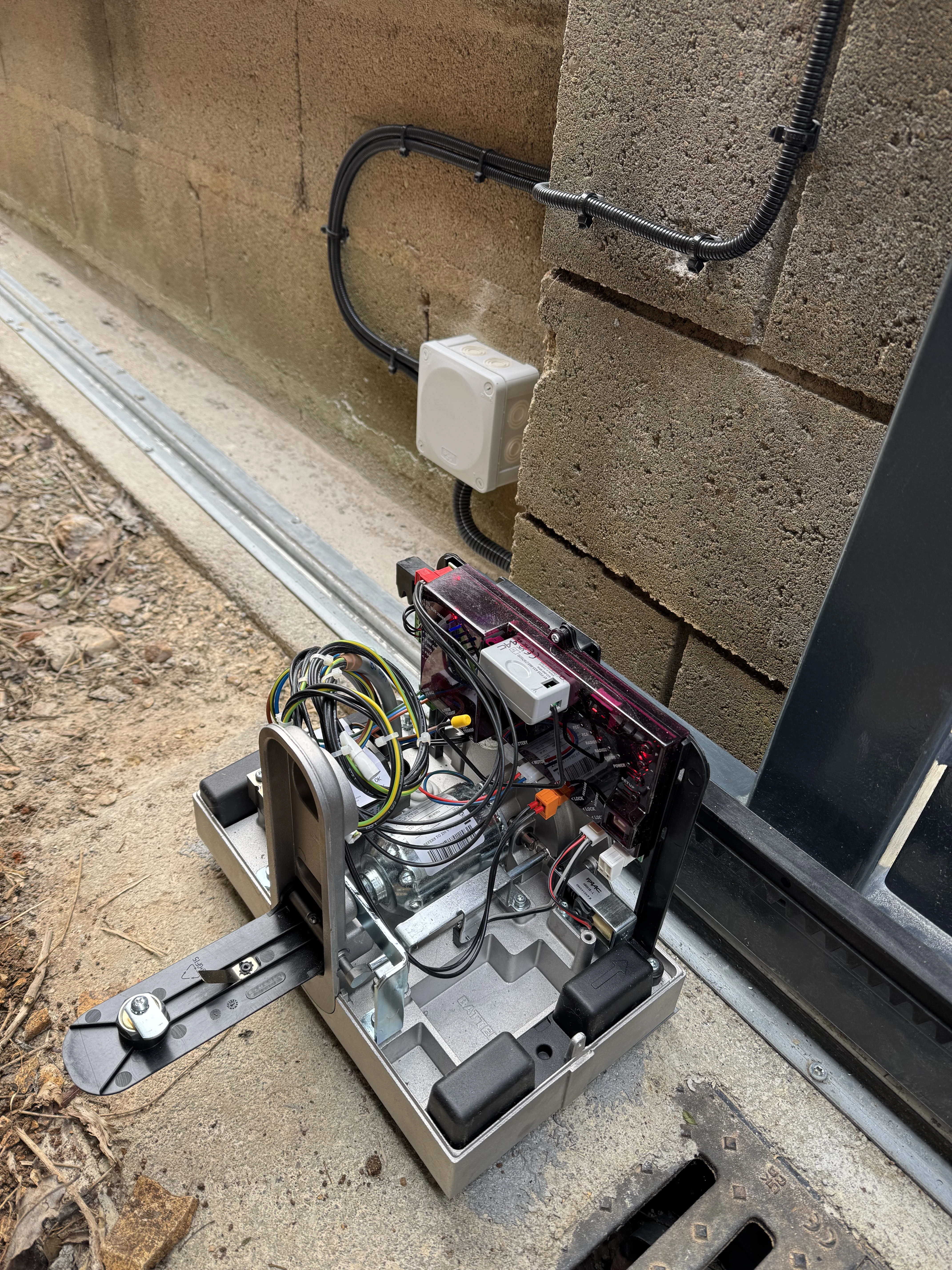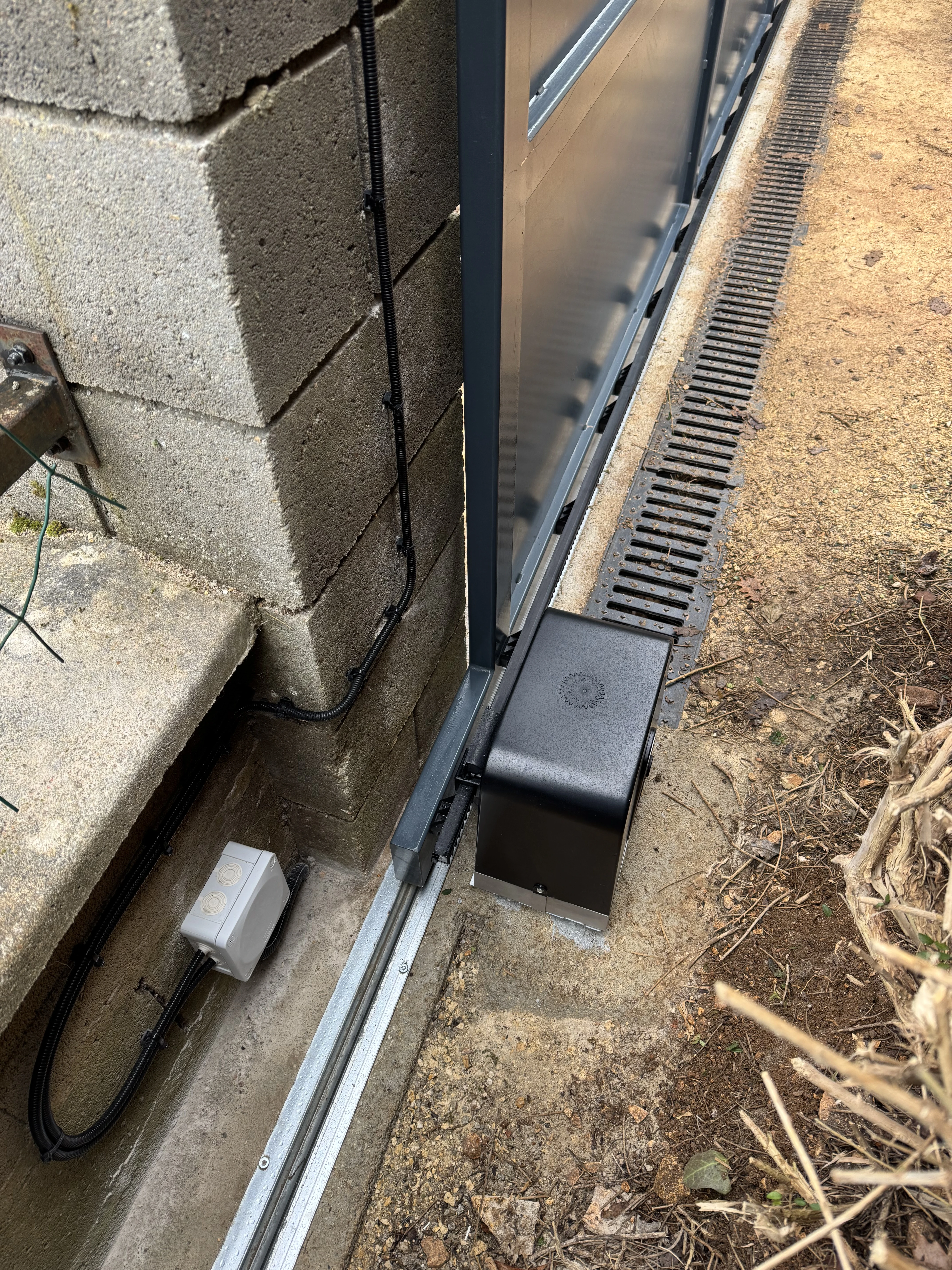 Réalisation d’un automatisme sur portail et pilasses existantes. Passage des câbles sous gaines et le plus discrètement possible à travers les pilasses. Modification de l’emplacement des gaines sous le motoréducteur. Liaison entre les deux pilasses en câble CNOMO 7G1² (pour les photocellules et le clignotant). La crémaillère nylon est fixée avec vis BTR et rondelles inox. Création d’un départ 2x10A pour l’alimentation du système, coffret sous protection 30mA en amont de l’interrupteur.