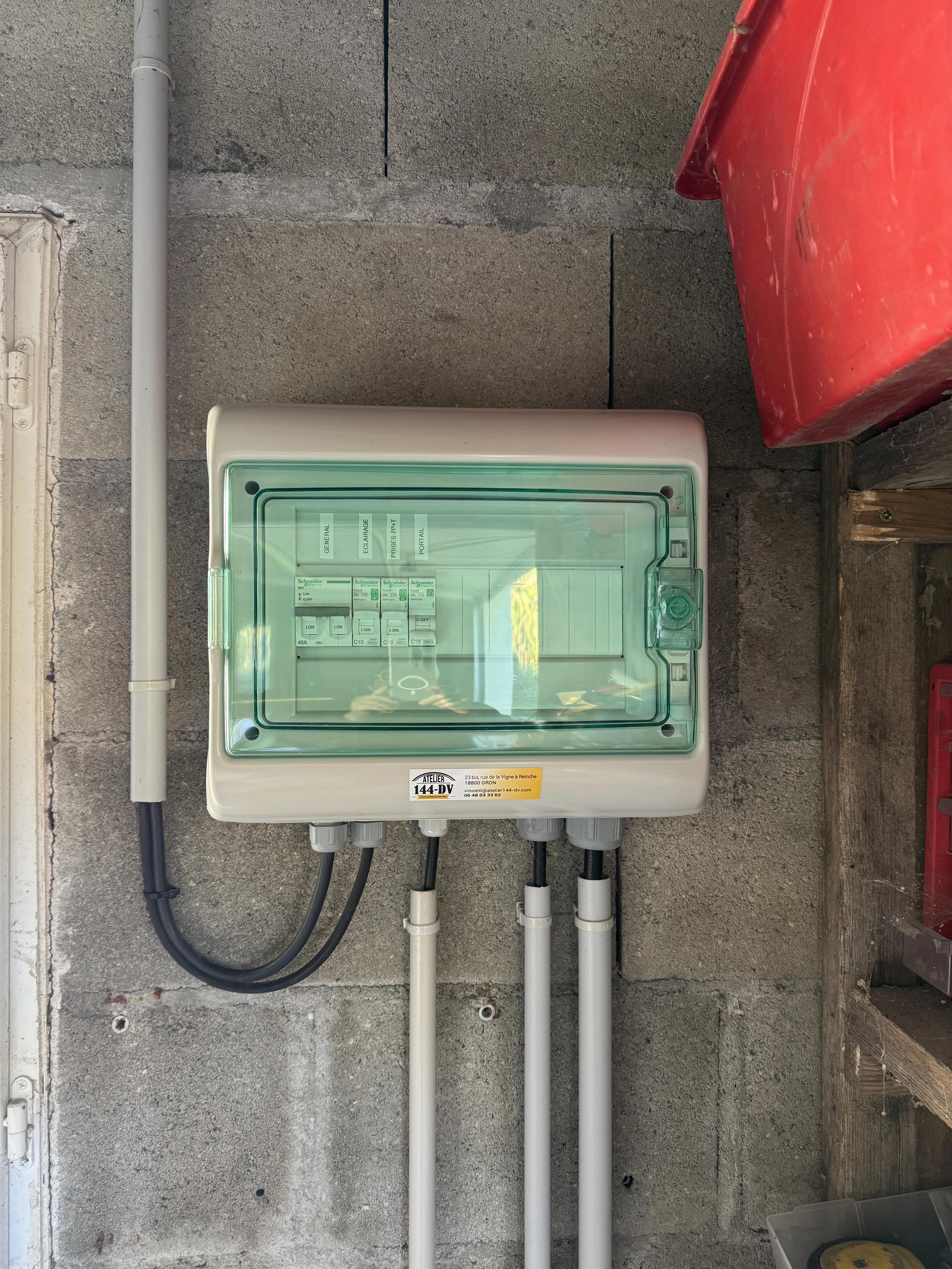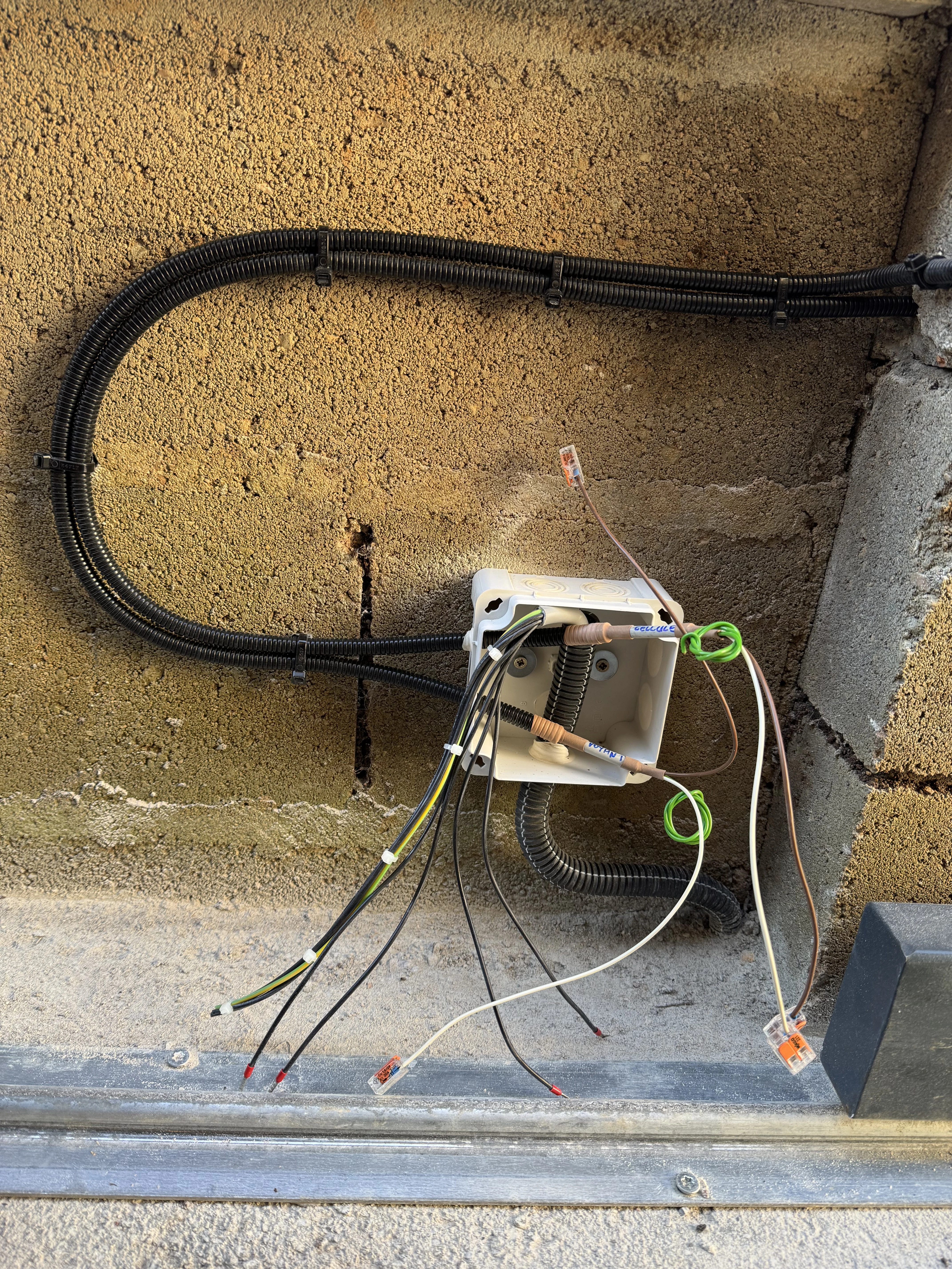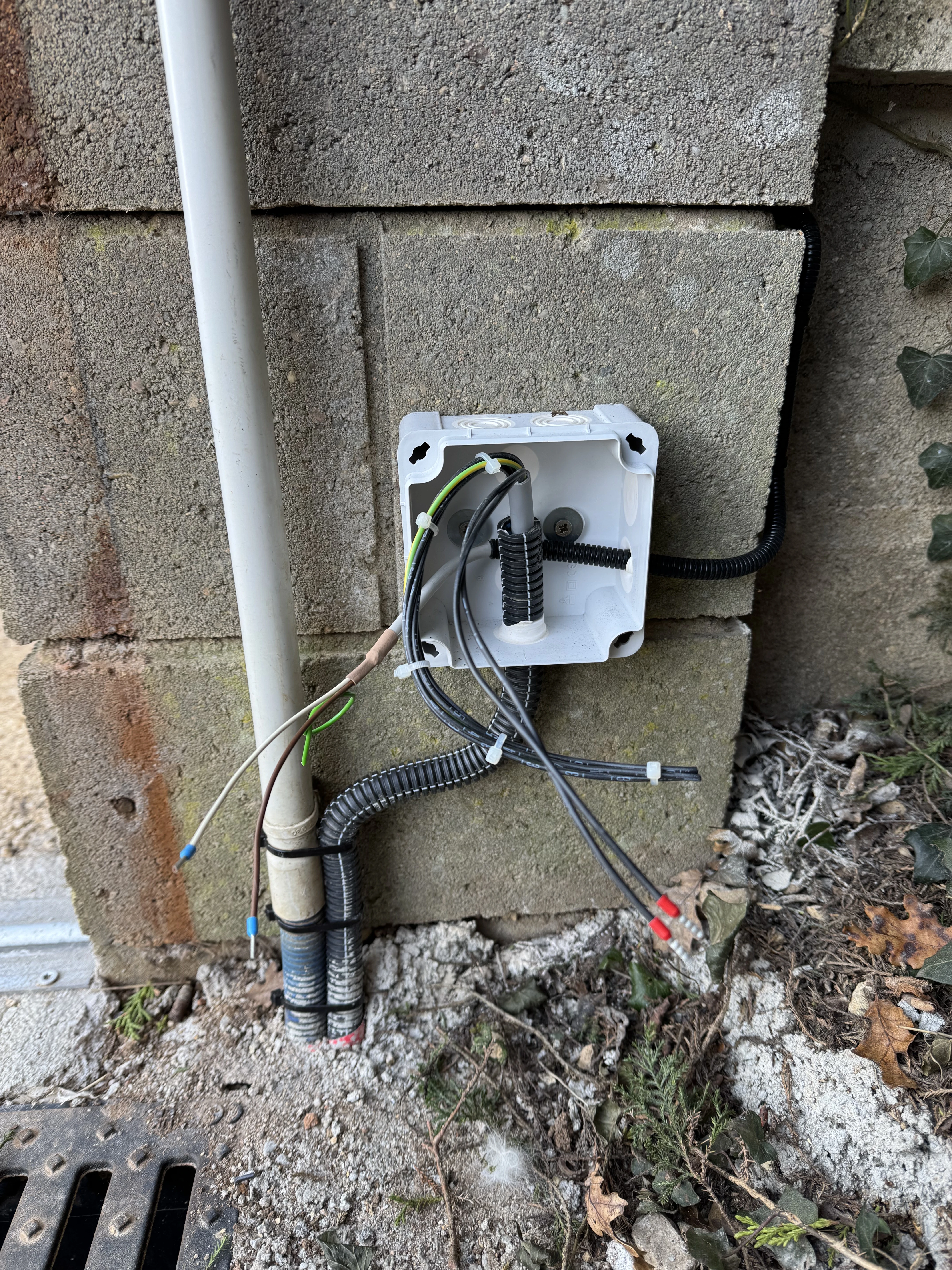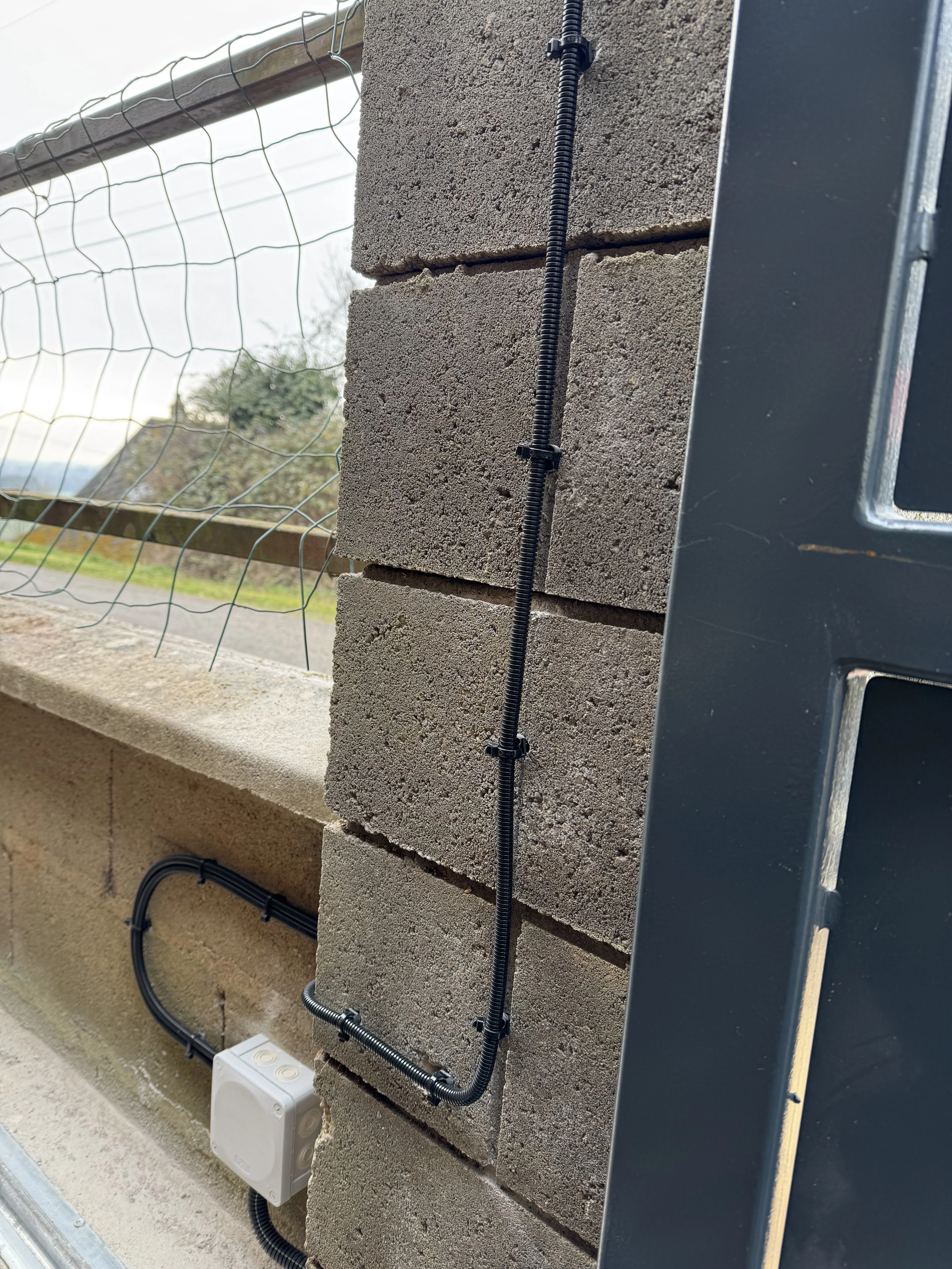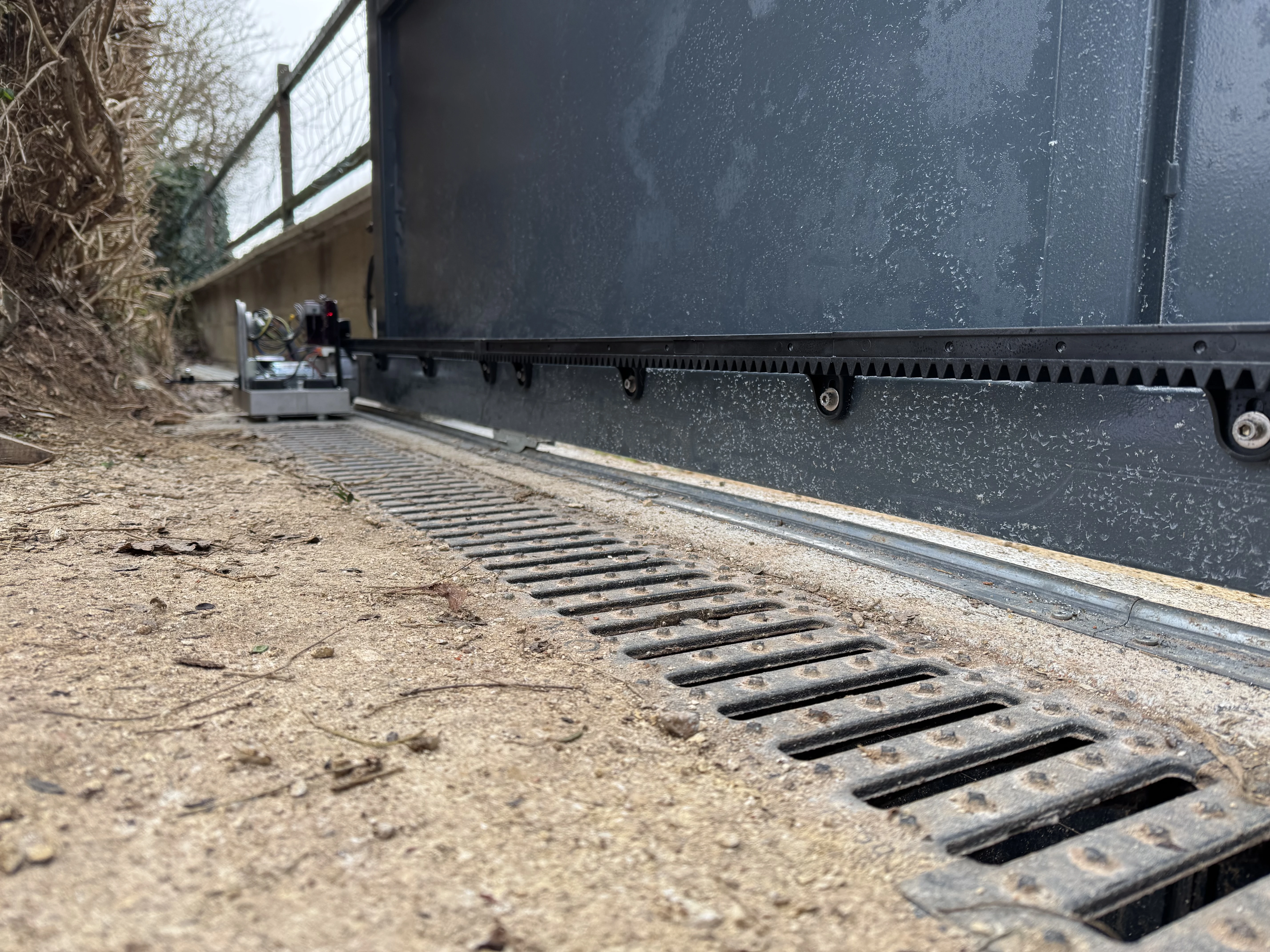 Réalisation d’un automatisme sur portail et pilasses existantes. Passage des câbles sous gaines et le plus discrètement possible à travers les pilasses. Modification de l’emplacement des gaines sous le motoréducteur. Liaison entre les deux pilasses en câble CNOMO 7G1² (pour les photocellules et le clignotant). La crémaillère nylon est fixée avec vis BTR et rondelles inox. Création d’un départ 2x10A pour l’alimentation du système, coffret sous protection 30mA en amont de l’interrupteur.