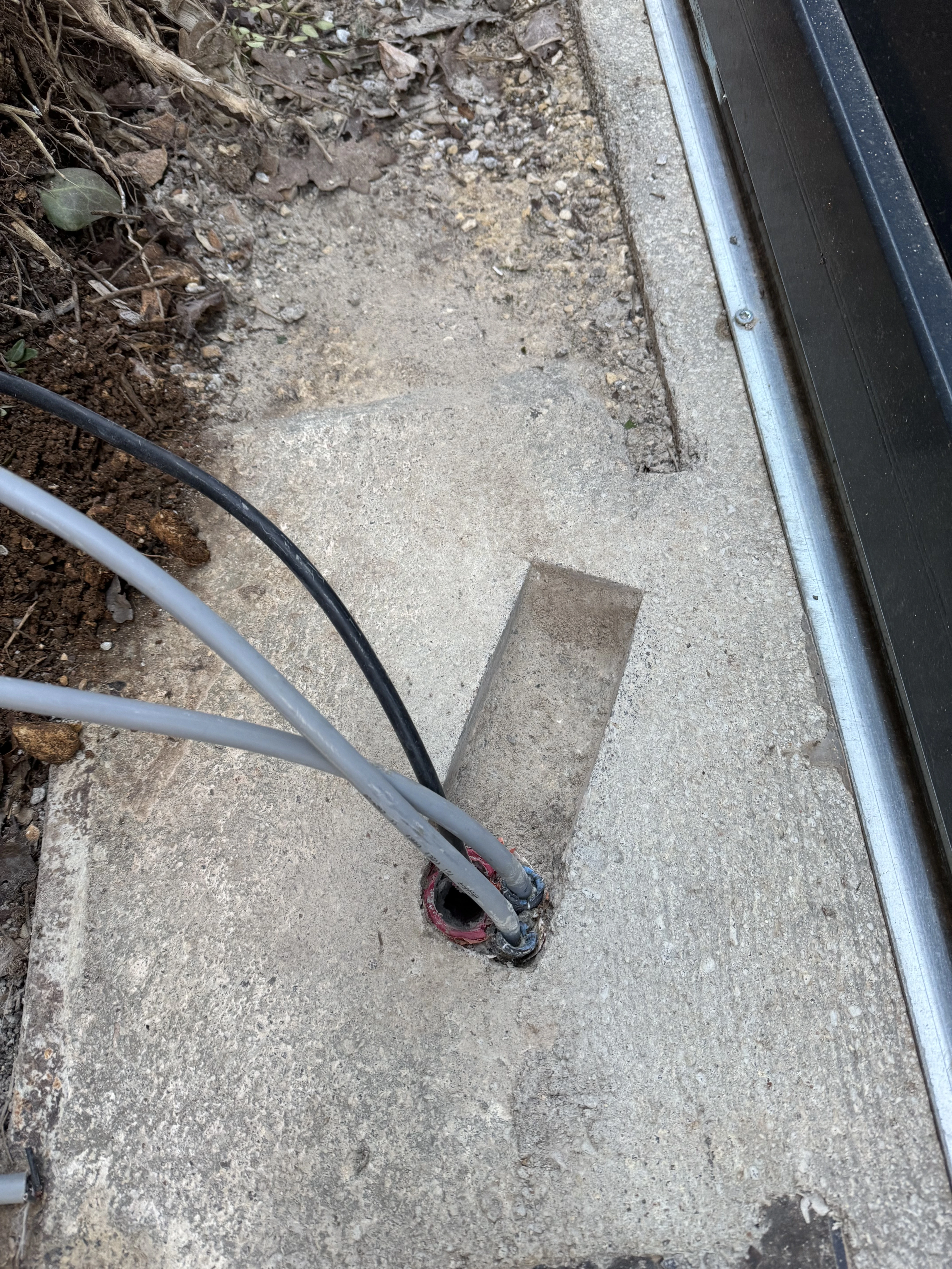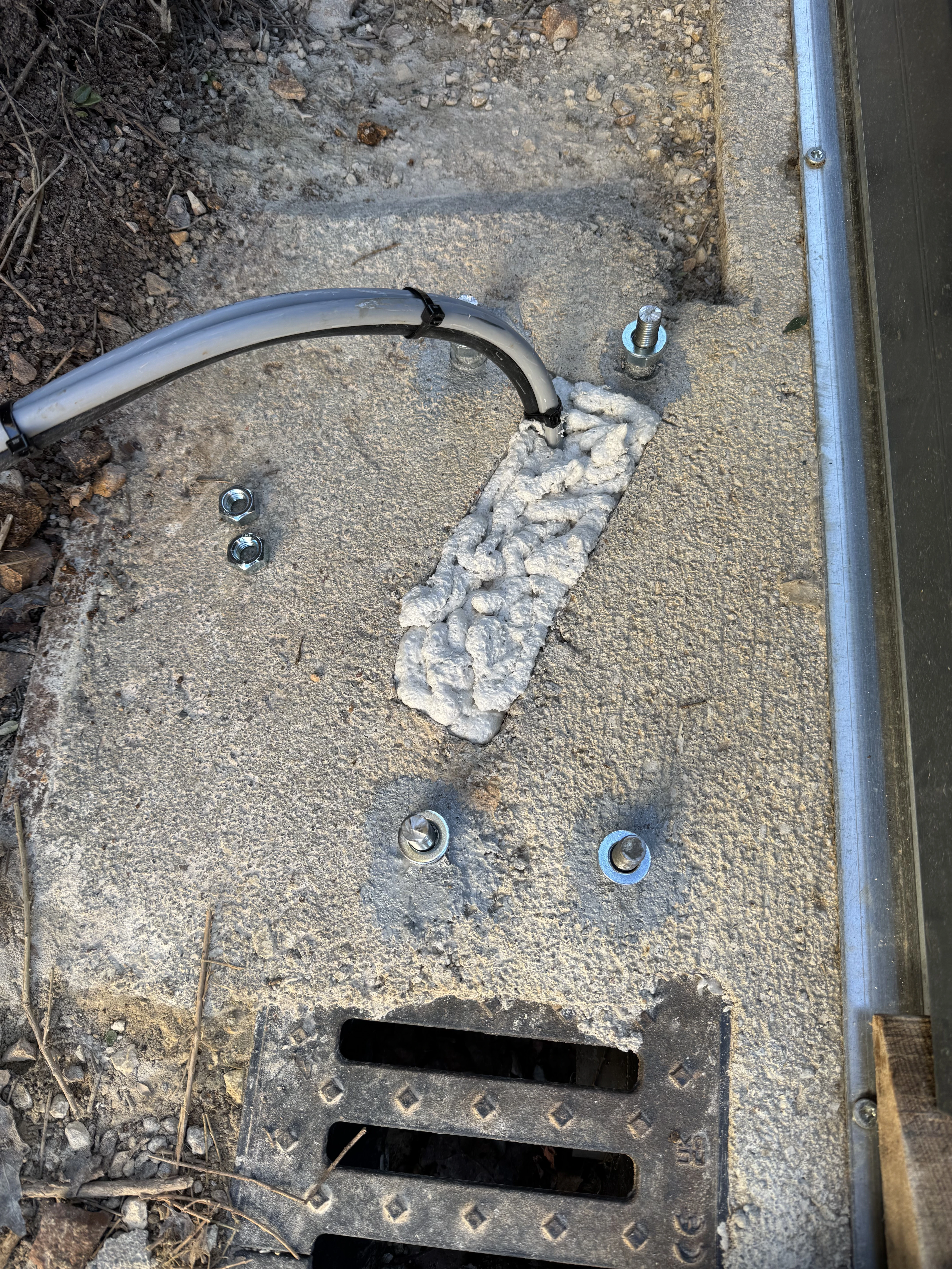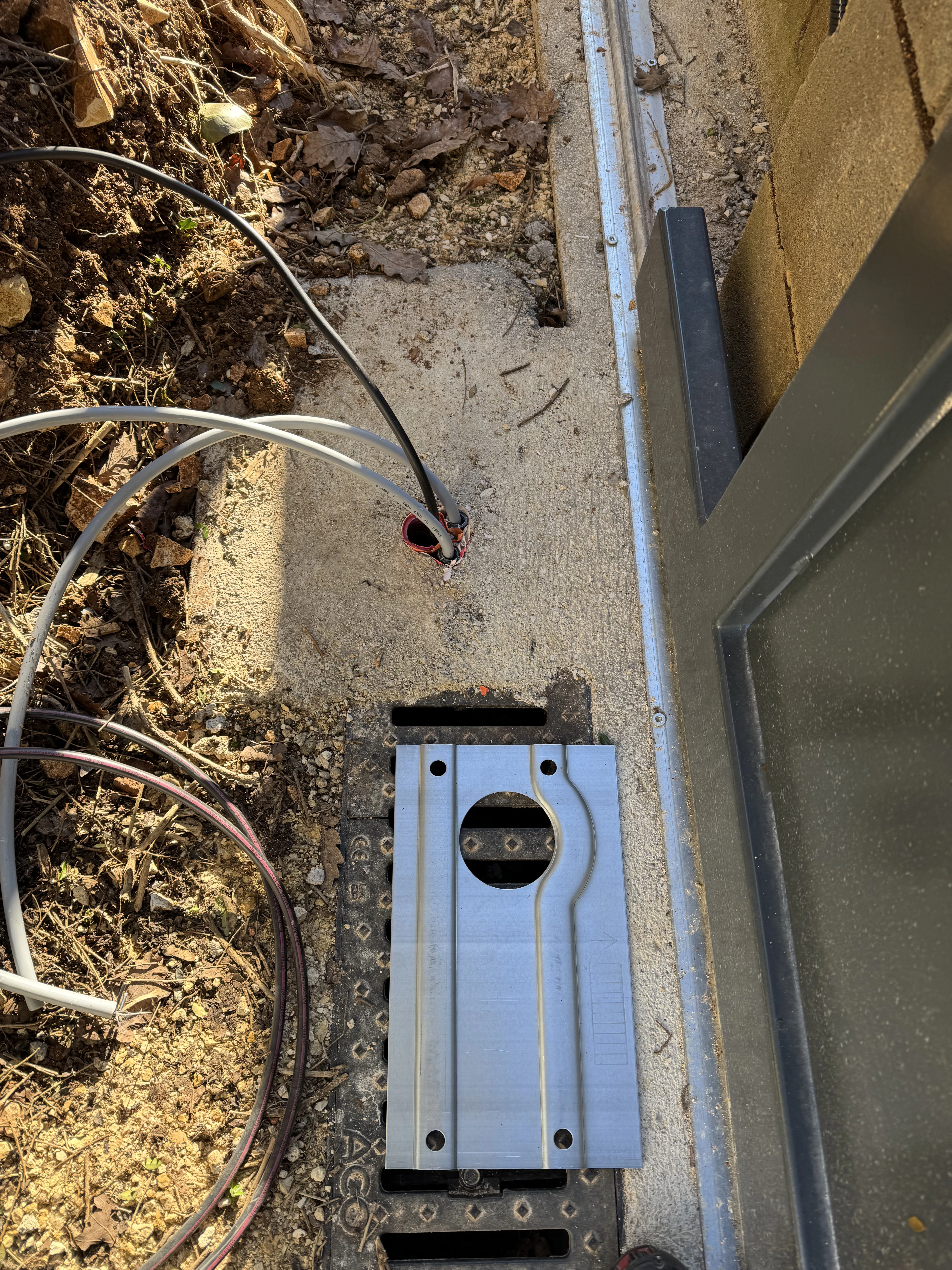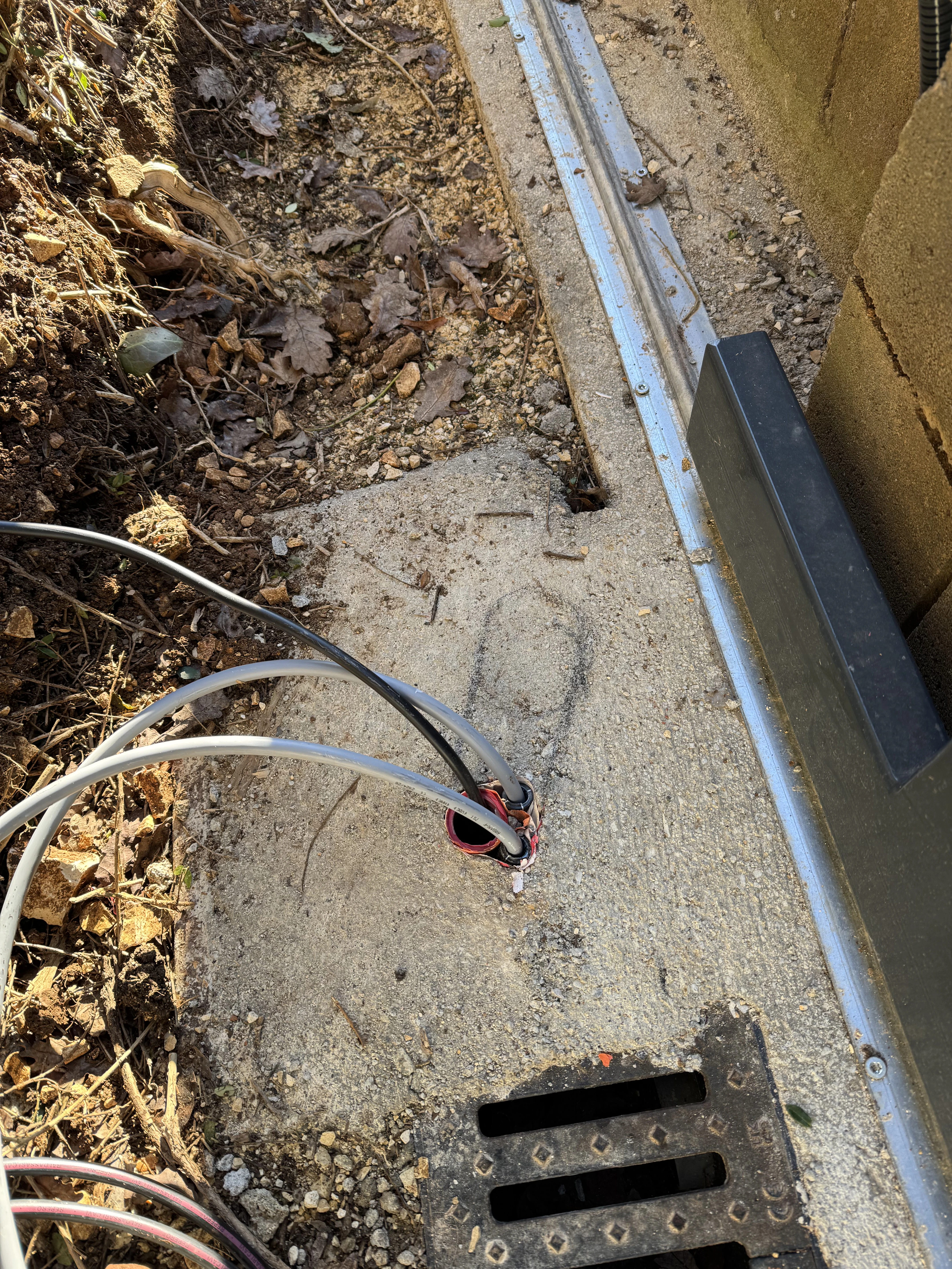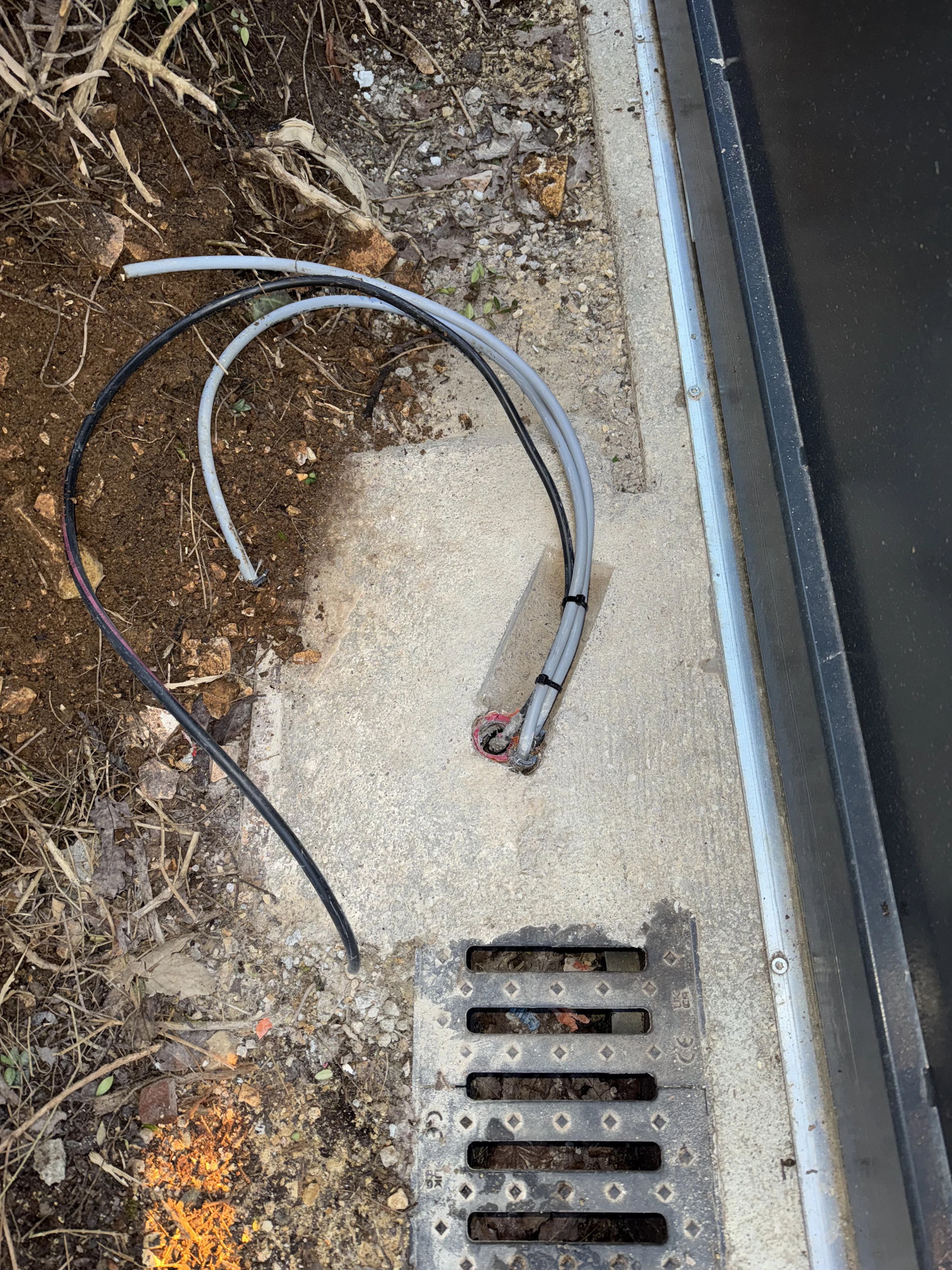 Réalisation d’un automatisme sur portail et pilasses existantes. Passage des câbles sous gaines et le plus discrètement possible à travers les pilasses. Modification de l’emplacement des gaines sous le motoréducteur. Liaison entre les deux pilasses en câble CNOMO 7G1² (pour les photocellules et le clignotant). La crémaillère nylon est fixée avec vis BTR et rondelles inox. Création d’un départ 2x10A pour l’alimentation du système, coffret sous protection 30mA en amont de l’interrupteur.